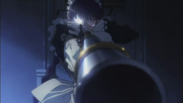 As Fabiola continues fighting more men, the machine-gunner car arrives, so Gustavo orders Chico to shoot into the bar as much as possible, making Bao fight for control of the phone. Chico relays the order to Marrero, who begins continuously shooting at the bar. Ducking, Fabiola avoids the bullets and responds by launching a grenade outside, which hits one car that flips onto the machine-gunner car, forcing Marrero to abandon it. Standing up, Fabiola yells at the men to leave with their men if they want to live, firing another shot above her as a warning. Accordingly, the men heed her warning and retreat entirely. As the girl insults the town, Gustavo points his pistol at her, causing Revy to do the same to Gustavo. Irritated, Gustavo runs away as Benny and Dutch arrive at the destroyed bar. Elsewhere, in his penthouse, Mister Chang is briefed by Biu on the Colombians making a move. Deducing that Roberta's goal is to avenge her slain master, the Triad boss confesses that he is bothered by the fact that they do not know Roberta's supposed location in town. As Benny drives for the pirates and Fabiola, Dutch asks the girl if all maids at her manor carry heavy weapons. Being teased by Revy, Fabiola pushes her away and answers that only she and Roberta use firearms. Nonetheless, she admits that the other three maids do not know that she carries weapons, specifying that she was hired for protecting Garcia while Roberta is away.