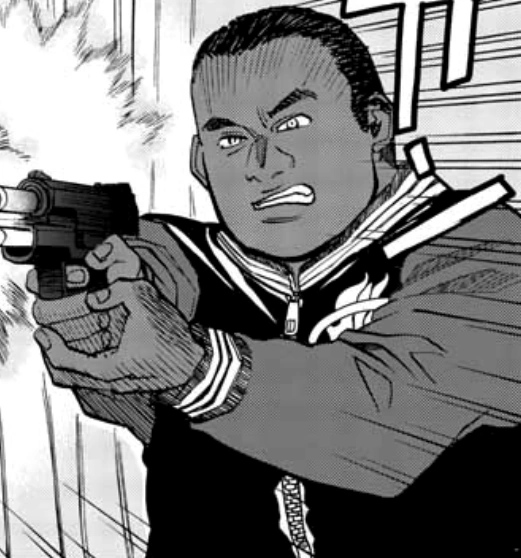 Cutter is an African-American man with a medium build and short black hair. He wears a dark-colored Miami Heat varsity jacket, jeans, and white sneakers. He carries a pistol for a weapon.