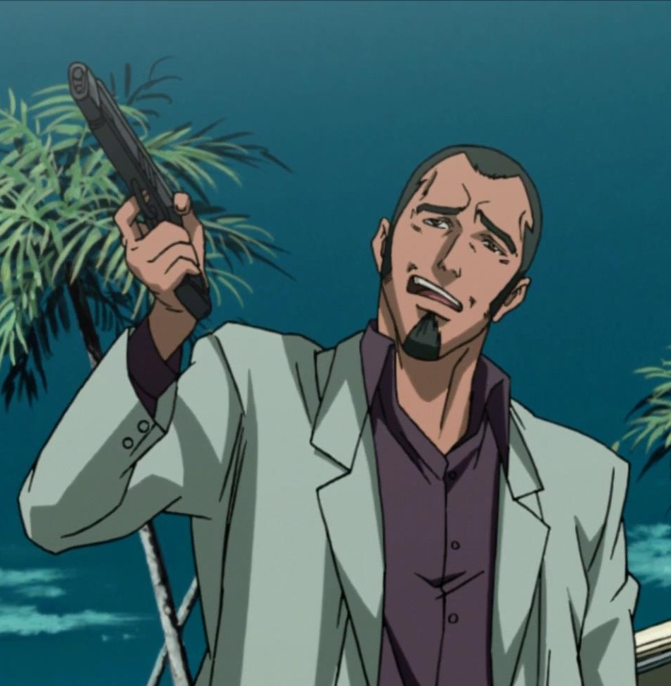 Consequently, Elvis and his men immediately ducked behind their cars for protection. During the initial firefight, he ordered his men to shoot back, whereas Lobos told them to hold their fire. Lobos tried to negotiate with Revy, Eda, and Rico. When this failed and the three continued shooting at the henchmen, Yolanda appeared and pulled out her custom Desert Eagle, shooting one of Elvis' cars and flipping it over. Terrified of the continuing hail of bullets, Lobos had Elvis dragged away from the church by two of his subordinates and into another car with which they drove away. As he was dragged away, he cursed the women and threatened to make mincemeat out of them.[4]