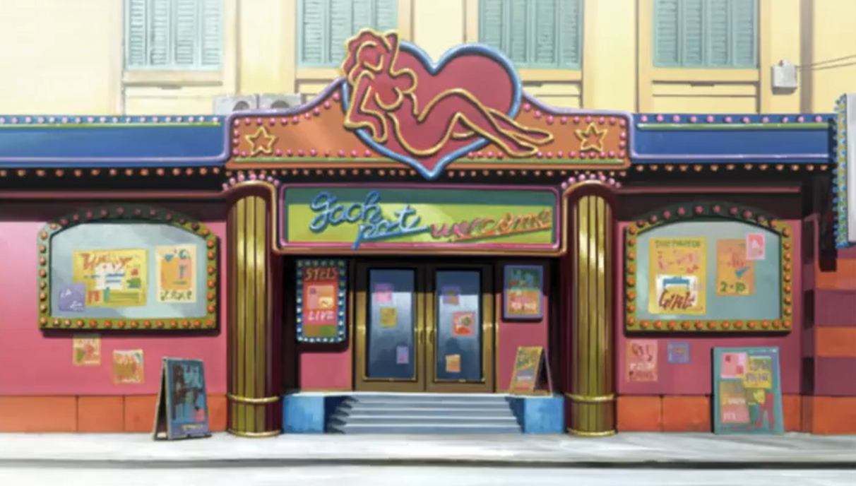 - The building's neon sign of a woman outside the front entrance first appeared in the anime. Moreover, the building's exterior sign and the words "Jackpot welcome" began appearing in the Black Lagoon manga starting in Chapter 89. In the club's first appearance in Black Lagoon Chapter 09, the word "welcome" and the letter P are the only visible parts, as the rest of the top exterior signage (including the neon outline of a woman) is not visible.
