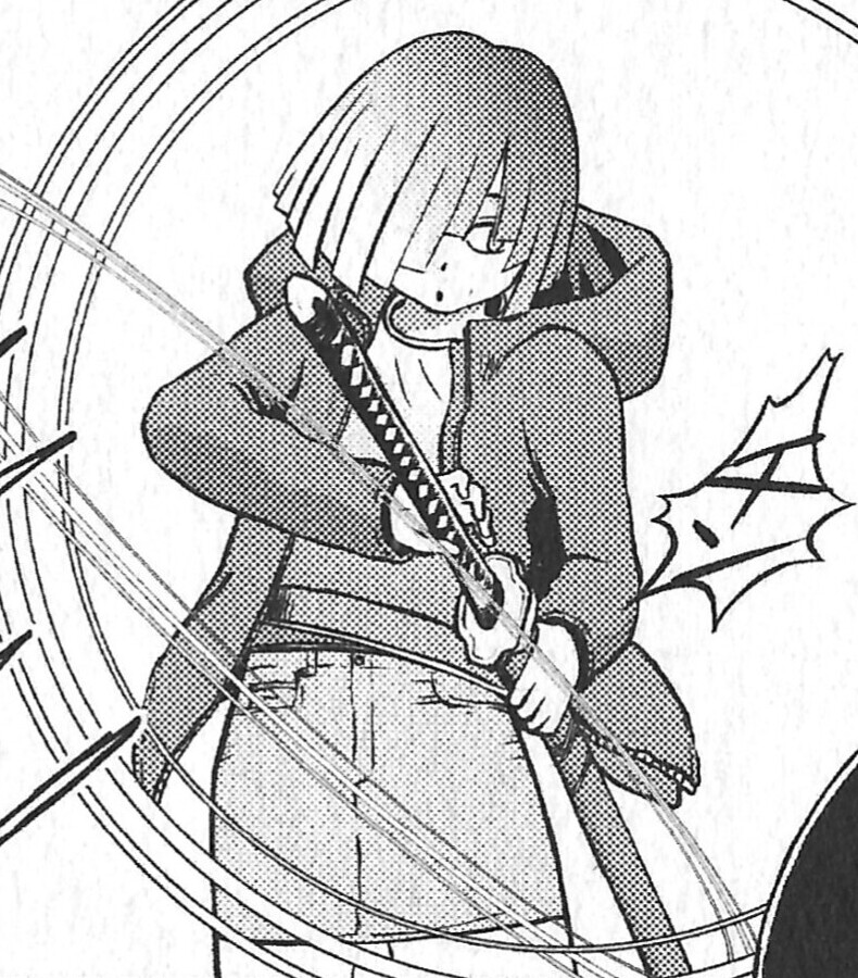 Jacqueline is a young girl of skinny build and short height. She has light-colored hair styled into a bob cut that resembles the flat strings of a dry mop. She generally wears a light-colored short sleeve shirt, a denim miniskirt, and bumpy-soled shoes, but she has also been seen wearing a dark-colored hooded unzipped jacket, horizontally striped thigh socks, and sometimes wears square-framed glasses. Jacqueline prefers to use a katana as her special weapon.