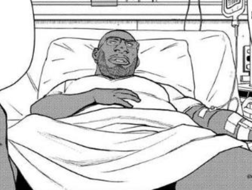 Jinx is a tall, bald African man with thin facial hair and dark eyes. He wears glasses and a light-colored suit with a patterned dress shirt underneath, but he is primarily seen in a hospital gown after the attack on him.